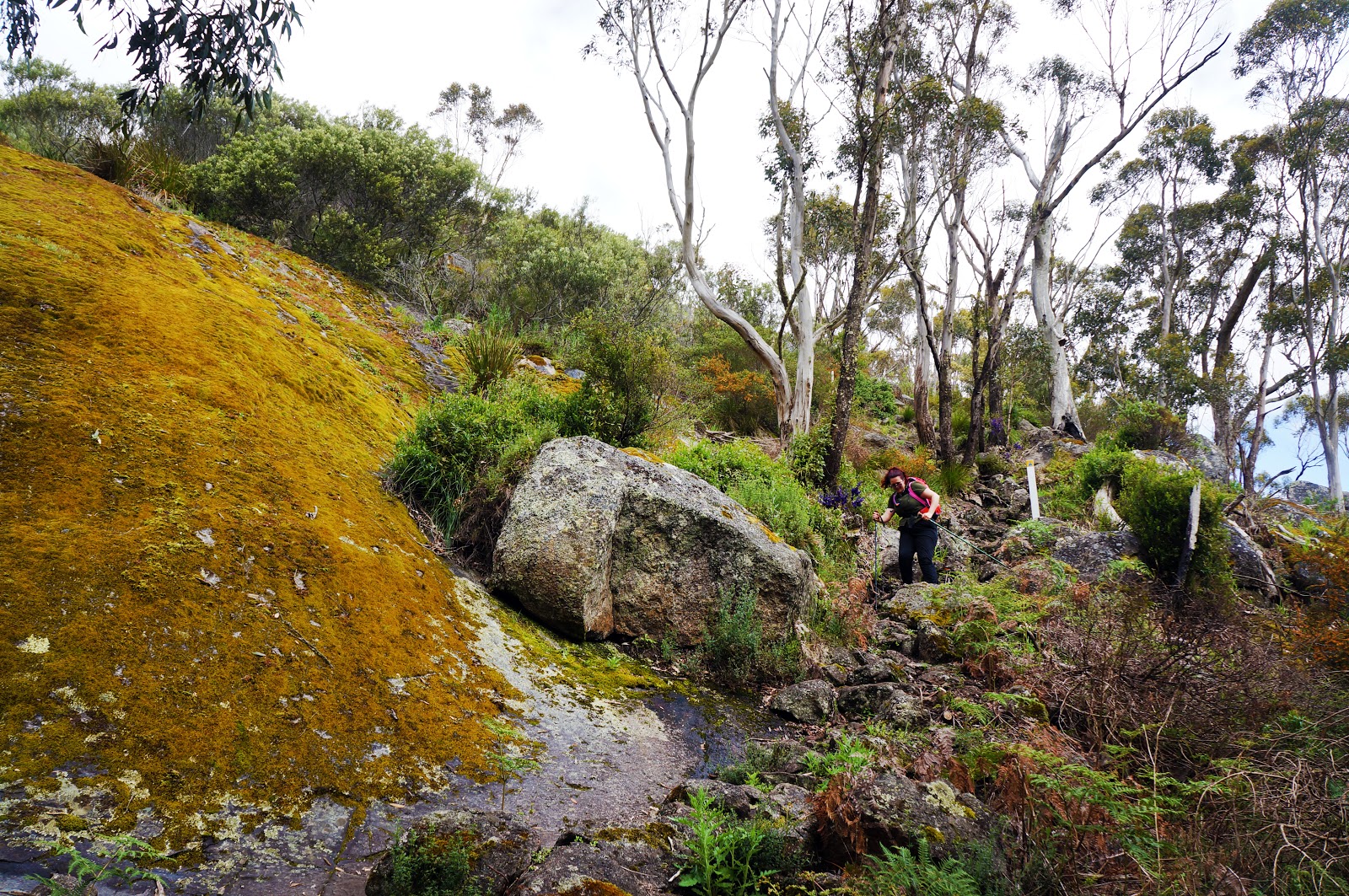 While the Granite Skywalk is dominated by the ascent through Karri forest, the Karri forest section of the Nancy Peak Circuit is relatively brief, and it only took Alissa and I thirty minutes to make it out to the first of the moss-covered granite outcrops. Like many other granite hills and mountains in the South West, metal marker pegs are used to guide walkers, however the path is fairly easy to follow - just look for the breaks in the moss.