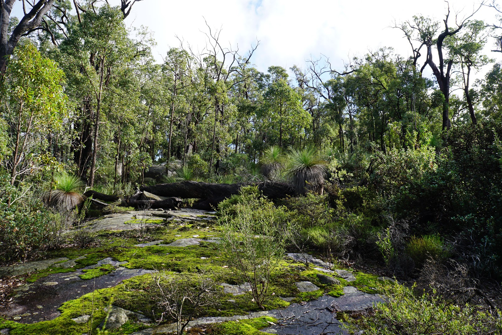 Across the top of the granite dome, a faint pad could be seen. Keen to avoid the slippery slope, Alissa and I followed the pad as we made our way to a steep ascent. The view from up here was fantastic - while Jarrah often looks thin, scrappy and frankly ugly in its regrowth state, even the thinnest, youngest and most excessively prescribed burnt Jarrah can look lovely as a whole forest. With the moody, cloudy skies, Alissa and I were really enjoying the scenery even at this early stage.