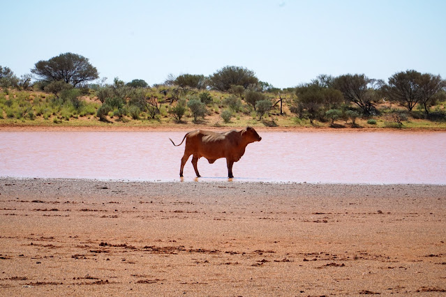 After pulling into check out the camping area at Temple Gorge and getting our hands dirty emptying our jerry can of spare fuel into our X-Trail's fuel tank, Alissa and I got back on the road for our last bit of unsealed road riding to Gascoyne Junction. On the way out, a cow standing by a pool of water served as a fitting finale to our road trip through the Upper Gascoyne.